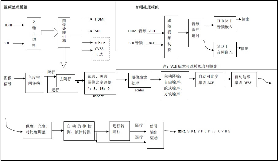 1、支持最高3G-SDI 或HDMI 數字視頻多格式信號,輸入3G-SDI 或HDMI 信號,輸出高達3G-SDI 或者4K-HDMI 視頻信號,各信號格式之間任意互換; 2、HDMI/DVI master 視頻整理功能,客戶很容易將電腦的屏幕素材直接轉換為任意的SDI播出信號,輸出信號可以選擇內鎖相方式或者跟隨輸入信號的時鐘,轉換后的SDI 信號各項技術指標符合廣電一級標準; 3、多種格式下變換(高清到標清),多種格式上變換(標清到高清),交叉變換(各種高清格式之間相互變換,例如:1080p 30 到1080p 60); 4、對疊加了椒鹽噪聲,隨機噪聲或者編解碼后的方塊噪聲有一定程度的降噪作用,在編碼器前端加入轉換盒處理后,可以有效提高后端編碼器的編碼質量和效率; 5、高標清變換器用于轉換任意格式的高清或標清輸入信號到多種格式的輸出信號,廣泛應用于各個領域。非常適用于前端到非線性編輯或作為視頻轉換或變換工具; 6、信號變換器支持16Bit精確度,128位價FIR濾鏡,13級水平濾鏡和9級垂直濾鏡,N制P制互轉; 7、支持I隔行制式信號到P逐行信號之間轉換,可以將隔行信號進行優越的去隔行處理,輸入到電腦進行各項非編后期制作; 8、上下變換器支持全景,14:9,pillar/letter 和cut 4 種轉換模式;是個名副其實的百變轉換盒; 9、最高HDMI 輸出分辨率達到3840x2160 像素點,帶編碼開關調節輸出信號格式; 10、該處理器有V1 和V2 兩個版本,V2 版本集成了YPbPr 高清晰度視頻模擬分量輸出接口和標清(下變換)模擬CVBS 接口(俗稱AV 輸出),YPbPr 輸出最高支持1080P60 分辨率,最低支持NTSC 的720x480i60 分辨率;同時CVBS 輸出支持PAL720x576i50 和720x480i60,非常適合電視臺高標清同播時使用; 11、數字視頻處理器以其優秀的廣播級質量、圖像增強、圖像降噪,反交錯等功能,廣泛應用于專業視頻應用領域;