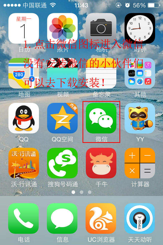 第一步:點擊手機中安裝的微信圖標(沒有下載的小伙伴們和去微信官網下載安裝,IOS用戶可以去Appstore或者pp助手等途徑獲得)