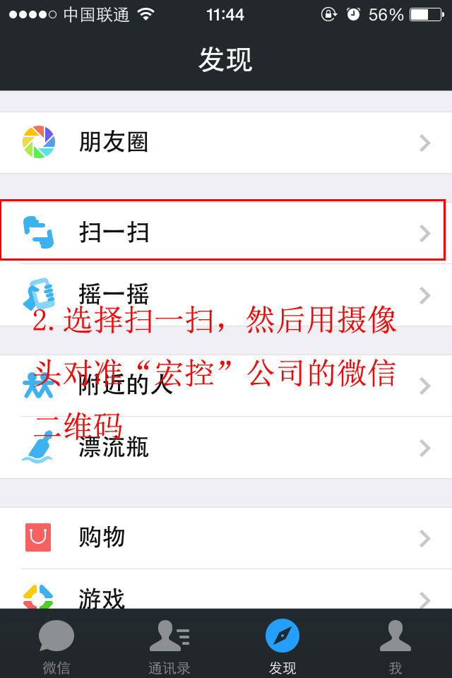 第二步:進入到微信的發現選項,選擇掃一掃,然后對準宏控公司的微信二維碼即可